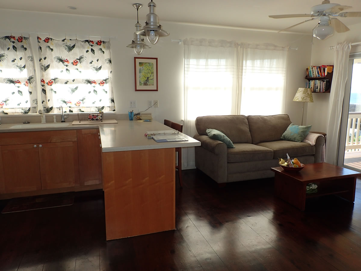 The 500 sq.feet central air-conditioned apartment is upstairs (downstairs is the open garage), surrounded by a lovely Hawaiian tropical garden with bamboos, palm trees, gingers, heliconias and fruit trees. The inside is cozy and elegant. A separate bedroom with a queen-sized bed, full bath, and full kitchen complement the layout.